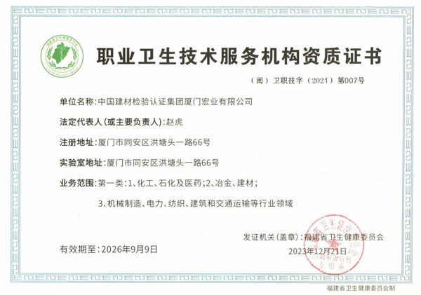 近日,中國建材檢驗認證集團廈門宏業(yè)有限公司(簡稱國檢集團廈門公司)順利通過職業(yè)衛(wèi)生技術(shù)服務機構(gòu)現(xiàn)場評審。福建省衛(wèi)生健康委員會、廈門市衛(wèi)生健康委員會、廈門市衛(wèi)生和計劃生育監(jiān)督所的領(lǐng)導及評審專家們采用“材...